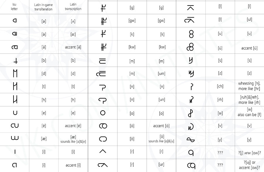 Siguiendo estos y otros métodos, los compañeros del AC Initiates ruso finalmente consiguieron —como si se tratase de la piedra de Rosseta— atribuir cada signo del alfabeto Isu casi en su totalidad a un sonido específico con el material disponible en el juego hasta la fecha. Este es el resultado: