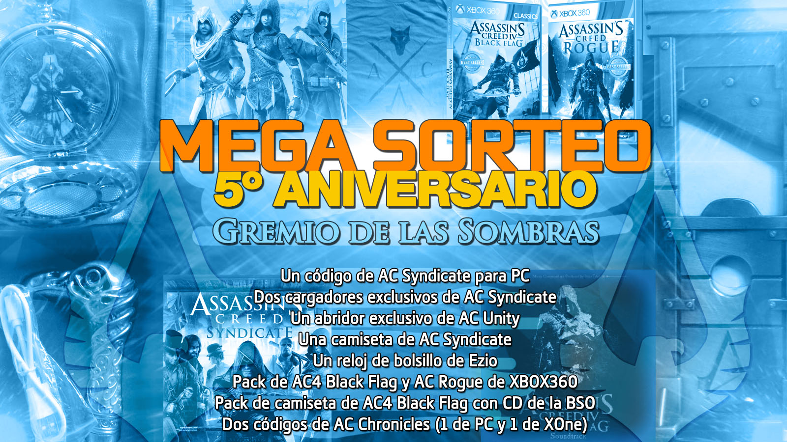 En @Gremio_Sombras están de aniversario y han montado un megasorteo con artículos de Assassin’s Creed. ¡LOS QUIERO! /blog/Mega-Sorteo-5o-aniversario-del-gremio-de-las-sombras