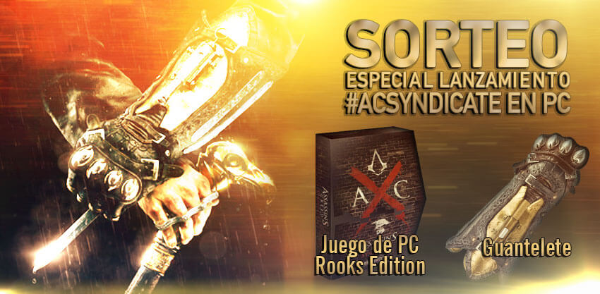 En esta ocasión sorteamos un Assassin’s Creed Syndicate: The Rooks Edition para PC, y el guantelete con la hoja oculta de AC Syndicate. Puedes participar en el sorteo desde el día 12 de noviembre hasta el día 18 de noviembre de 2015 a las 23:59 hora española peninsular. Podrán participar tanto personas que residan en territorio español como personas que residan en Latinoamérica*.