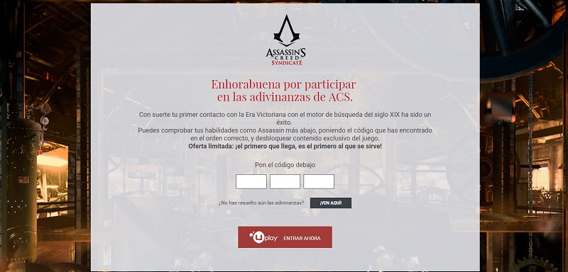 Cuando tengas los tres códigos los puedes canjear aquí. Escribe cada código de los acertijos en las cajas y pulsa «Uplay Entrar ahora» para enlazar las recompensas a tu cuenta de Uplay. El formulario te pedirá que elijas para qué plataforma quieres las recompensas, si para PS4, Xbox One o PC. Tras hacerlo, te llegará un correo de confirmación, pero el código para descargar las recompensas en tu consola u ordenador no llegarán hasta el lanzamiento oficial de AC Syndicate.