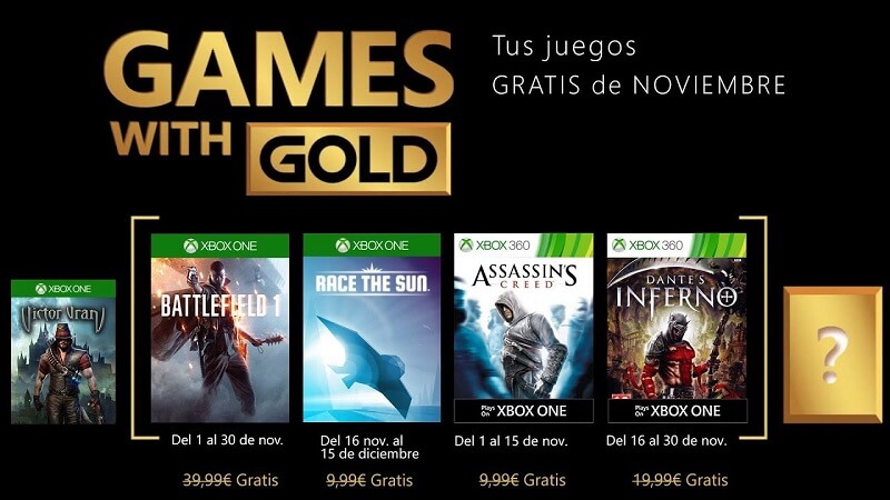 El juego original de Altaïr, Assassin’s Creed, estará disponible para Xbox 360 (y en Xbox One gracias a la retrocompatibilidad) desde el 1 al 15 del mes de noviembre. En Xbox One, los miembros de Xbox Live Gold también podrán descargar gratuitamente Battlefield 1 durante todo el mes y Race the Sun desde el 16 de noviembre al 15 de diciembre.