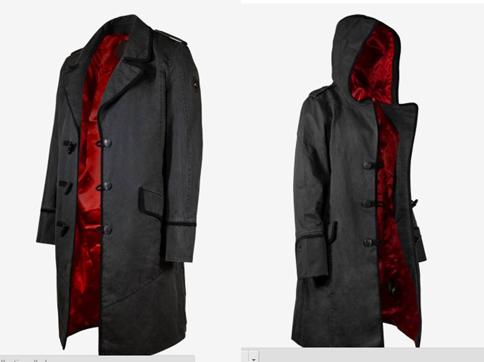 En primer lugar, tenemos un abrigo tres cuartos basado en la época victoriana con grandes solapas acolchadas. Está forrado de color rojo para que el contraste sea más vistoso, y también lleva tres botones con el logo de los Assassins, combinando la dureza de los materiales y la elegancia del corte. Una prenda perfecta para el otoño y para podernos mezclar por el lluvioso Londres, también con dos grandes bolsillos exteriores y otro más en el interior oculto para guardar nuestro instrumental de asesino. El cuerpo del abrigo está compuesto por una mezcla de algodón y poliéster y las mangas son de tafetán, el forro interior es de satén.