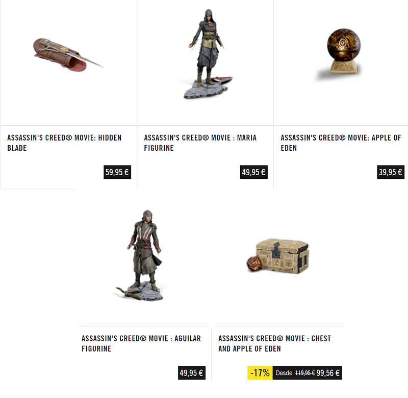 Ubicollectibles ha revelado el merchandising de la película, entre los que se encuentran una figura de Aguilar y otra de María que al juntarlas se crea un diorama, la hoja oculta de Aguilar y una réplica del Fruto del Edén que se empleó en la película de Assassin’s Creed.
