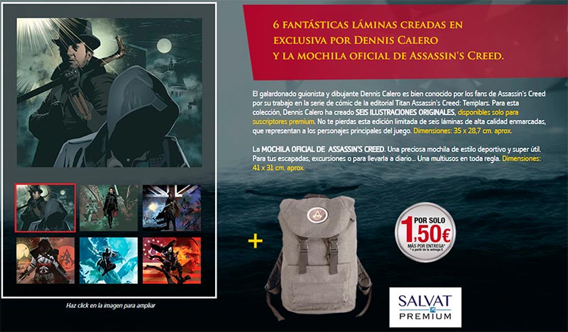 ¡Eso no es todo! Para aquellos fans acérrimos que todavía quieran más, pueden conseguir regalos extra al hacerse suscriptores premium: recibirán 6 láminas exclusivas creadas por Dennis Calero, el dibujante que trabajó en el cómic Assassin’s Creed: Templars, y una mochila oficial de estilo deportivo con el logo de la saga.